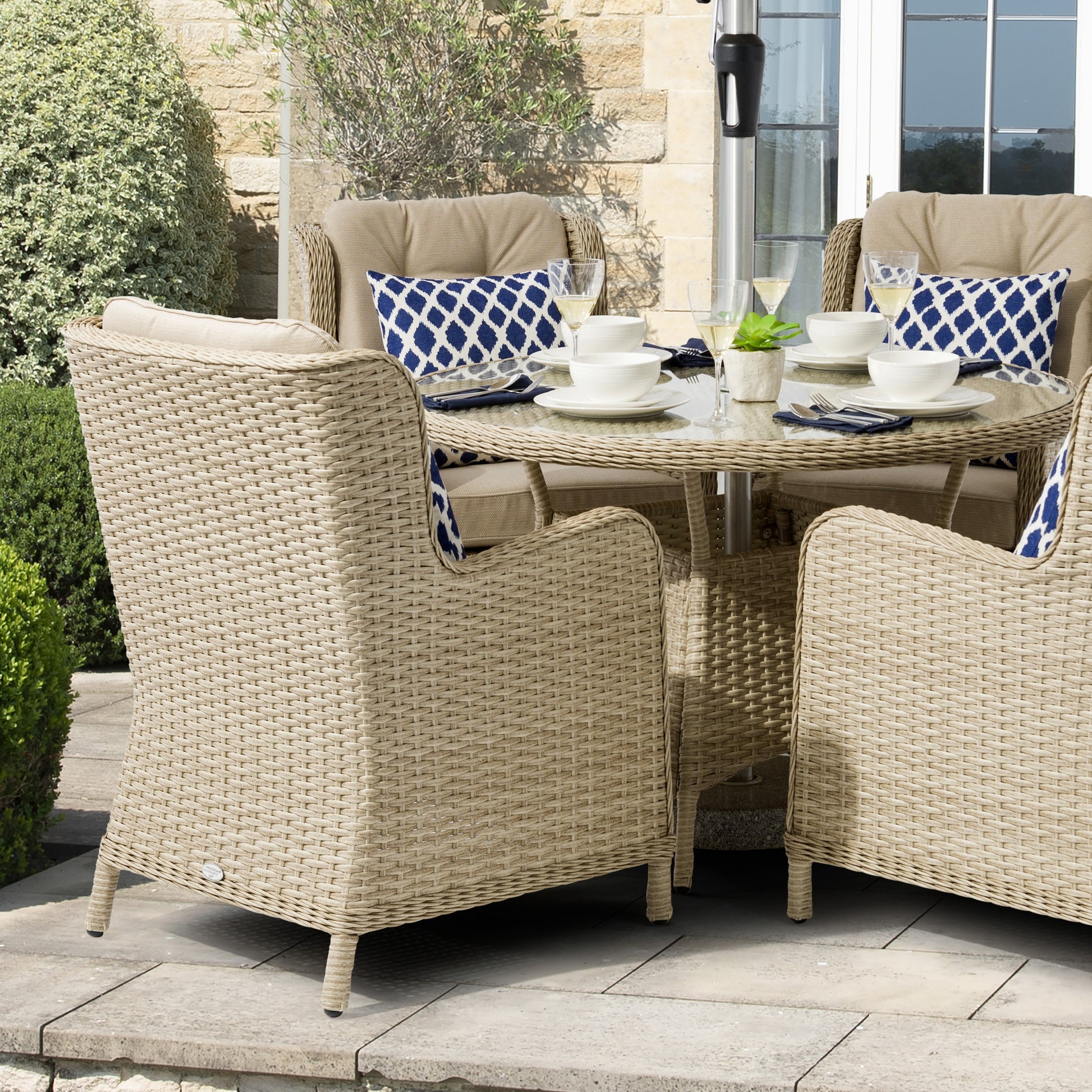 Designed for small-scale soirees, the Somerford 4 Seat Dining Set from Bramblecrest comprises a beautifully crafted table made from outdoor rattan in Sandstone. Four high-back armchairs feature indulgent cushioning in a tasteful Eco Oat fabric and a must-have parasol and base complete the set.