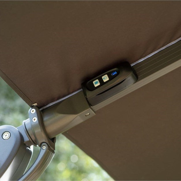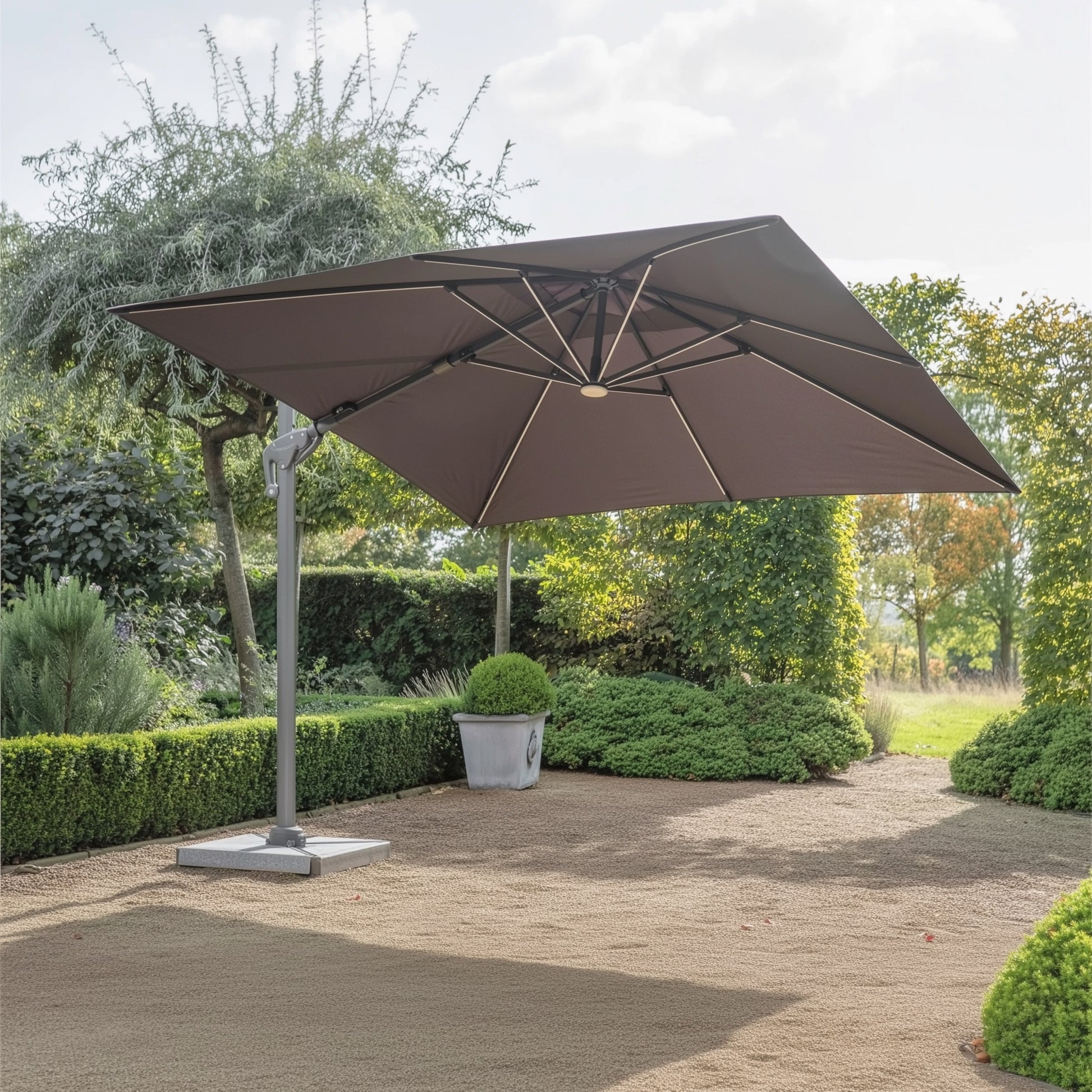 Compact and stylish, the Bramblecrest Truro 3m cantilever parasol brings versatile shade to smaller spaces. Its rust-free aluminium frame supports a UV50+ water-resistant canopy with smooth 360° rotation. Integrated LED lights add evening ambience, while a sturdy granite quadrant base ensures stability - blending modern design, practicality and day-to-night comfort.