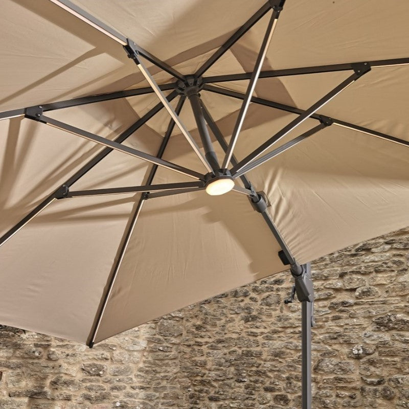 Compact and stylish, the Bramblecrest Truro 3m cantilever parasol brings versatile shade to smaller spaces. Its rust-free aluminium frame supports a UV50+ water-resistant canopy with smooth 360° rotation. Integrated LED lights add evening ambience, while a sturdy granite quadrant base ensures stability - blending modern design, practicality and day-to-night comfort.