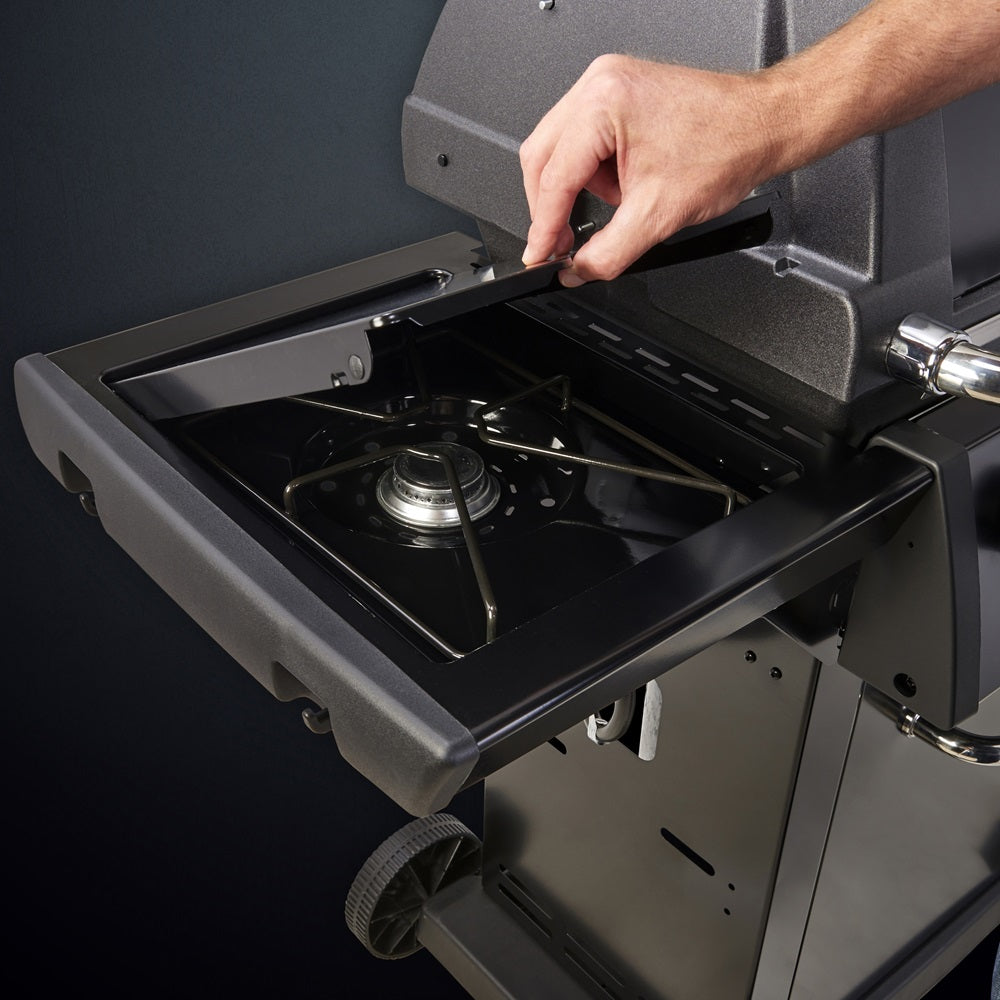 Broil King Royal 340 Shadow BBQ features 2258 sq. cm. primary cooking surface and includes 3 stainless steel Dual-Tube™ burners, 10 mm reversible cast iron cooking grids, stainless steel Flav-R-Wave™ cooking system, and electronic ignition. The Royal™ series features painted steel drop-down side shelves, and enclosed cabinet base.