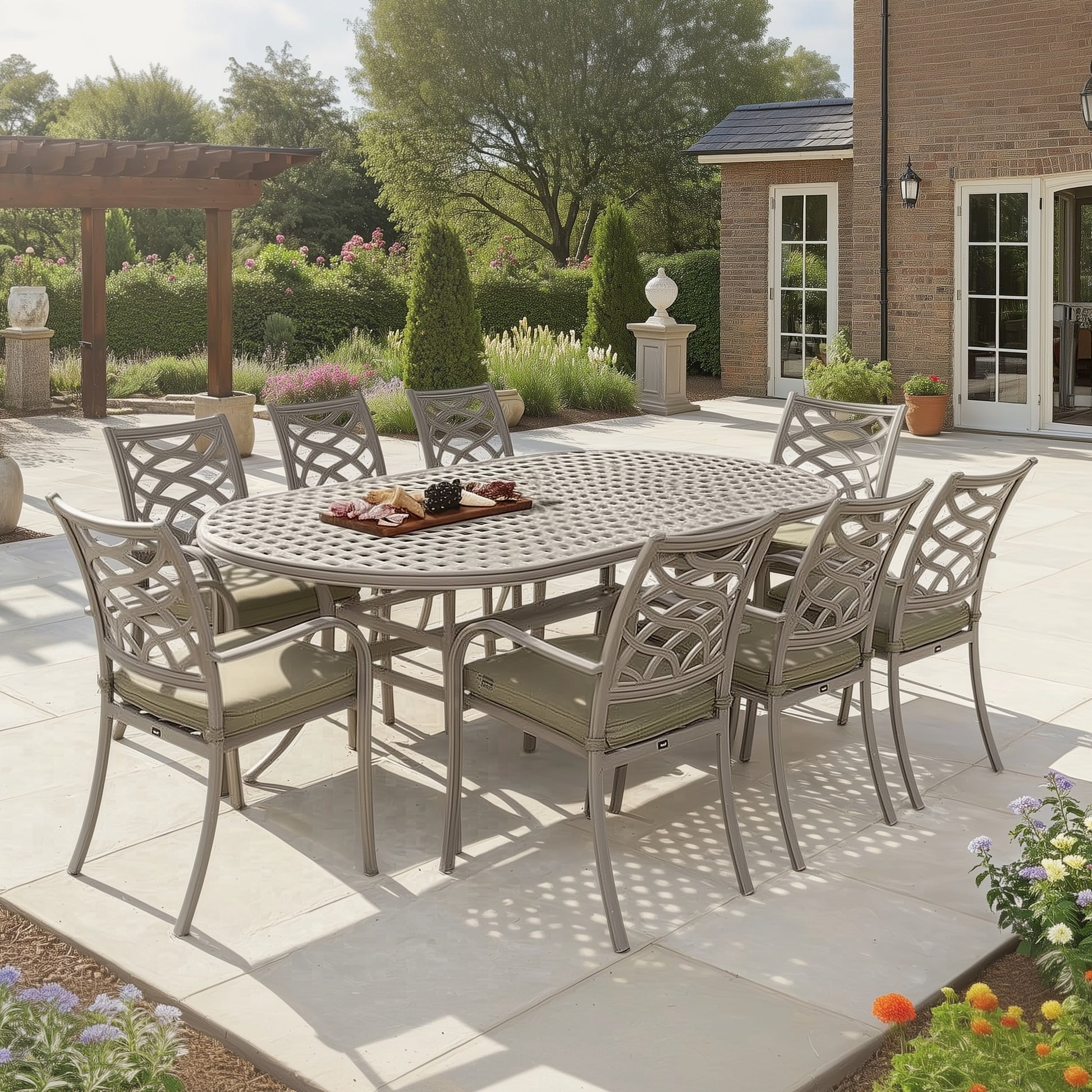 Host unforgettable outdoor meals with the Hartman Buxton 8 Seat Dining Set. Crafted from durable cast aluminium with a refined lattice-back design, this set blends strength and sophistication. Eight generously cushioned chairs provide exceptional comfort, while the spacious oval table offers plenty of room for family and friends. Complete with a matching parasol for stylish shade, the Buxton set is perfect for effortless outdoor entertaining all season long.